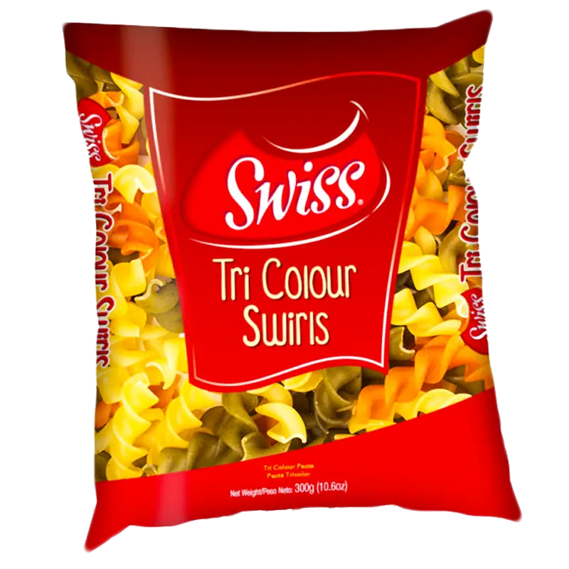 Swiss Tricolour Swirls Pasta is produced on the newest and most state of the art pasta manufacturing line in the world. Everyone can now find the quality pasta, that almost any Italian or nouvelle cuisine recipe calls for, at an affordable price. Ideal for all your pasta recipes!