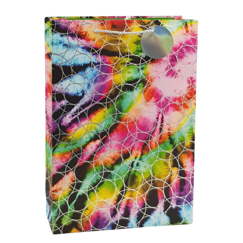 This Tie Dye Blast XL Gift Bag is the perfect way to show your appreciation for someone special. This extra-large gift bag is made from durable, high-quality paper and features a vibrant tie-dye design. The bag measures and is perfect for holding larger gifts such as clothing, toys, and more. The bag is also equipped with a reinforced handle for easy carrying.