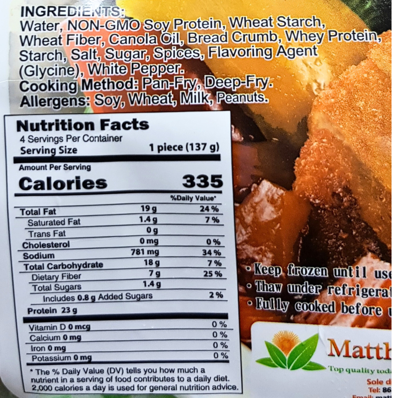 INGREDIENTS: Water, NON-GMO Soy Protein (Contains Soy, Wheat), Canola Oil, Whey Protein (Milk Product), Starch, Pasting Agent(Sodium Caseinate), Sugar, Salt, White Pepper, Cellulose, Maltodextrin, Spices.