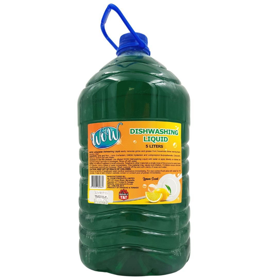 Wow Dishwashing Liquid is a 5-liter cleaning product with a refreshing lemon scent. It is designed to effectively remove grease and food residues from dishes.